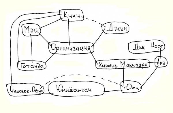 Затем я зашел в ресторанчик "Цуруока", выпил там пива и съел порцию тэмпуры. Время текло бесцельно, и постепенно солнце зашло. Sunrise, sunset... Точно двухмерный Пэкмэн на экране монитора, я в одиночку двигался куда-то, сжирая пространство-время и не оставляя позади себя ни черта. Ситуация застопорилась. Я ни к чему не пришел. Сценарий, по которому всё двигалось до сих пор, вдруг расслоился на множество побочных линий. А основная, которая могла бы связать меня с Кики, боюсь, затерялась бесследно. Я слишком увлекся эпизодами. Увяз во вспомогательных сценах мудреной пьесы - и теперь трачу время и силы, пытаясь вычислить, какая важней. В которой из сцен, черт побери, происходит главное действие? И происходит ли оно вообще?